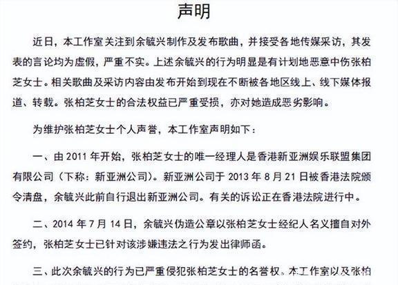 而且早在2014年,张柏芝就已经发律师函跟余毓兴终止合作了。